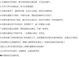 老公的家规虽然有些严格,但它们背后却蕴含着他对家的热爱和对生活的态度。作为他的另一半,了解并尊重这些家规,不仅能让你更好地融入他的世界,还能让你们的家庭生活更加和谐美满。所以,亲爱的,下次当你看到他认真执行这些家规时,不妨微笑着给他一个拥抱,告诉他:“有你真好!”
